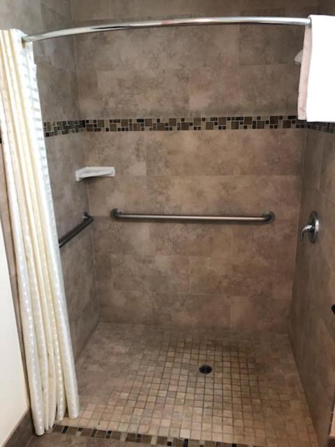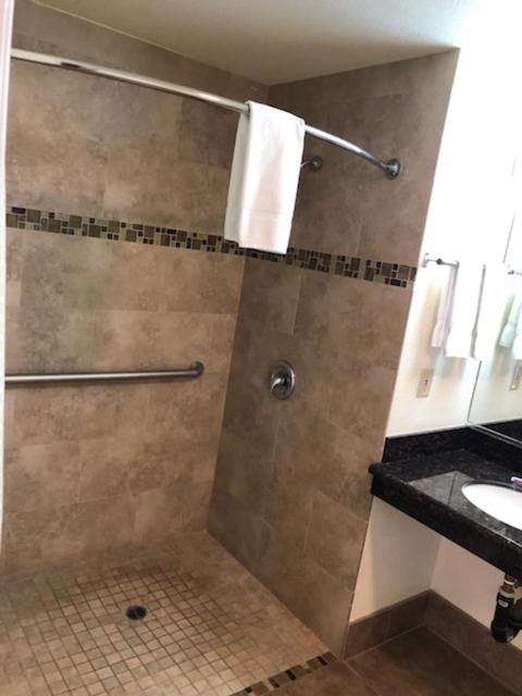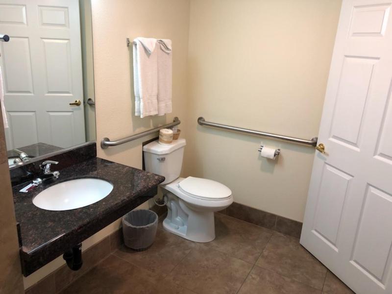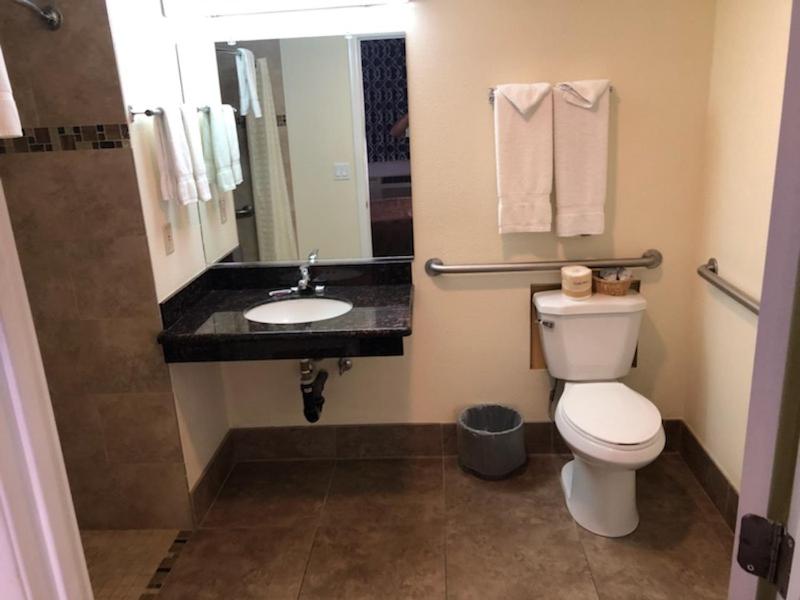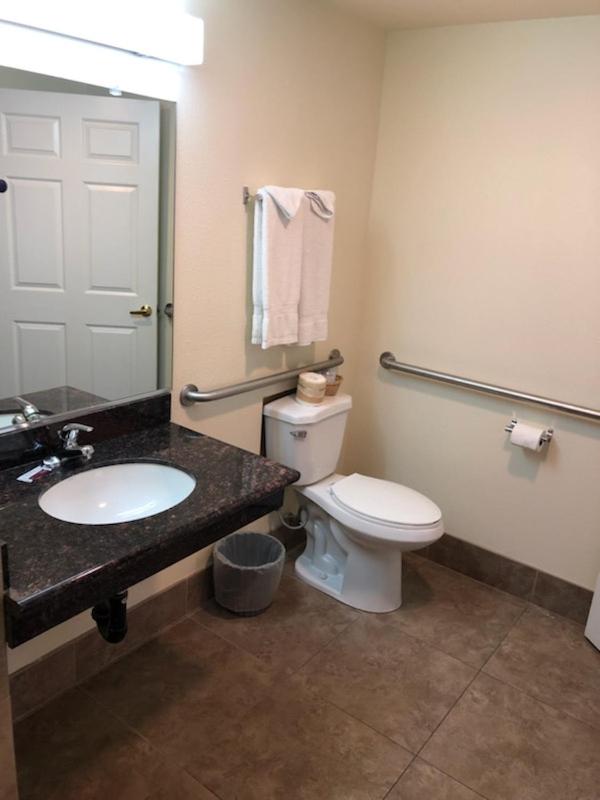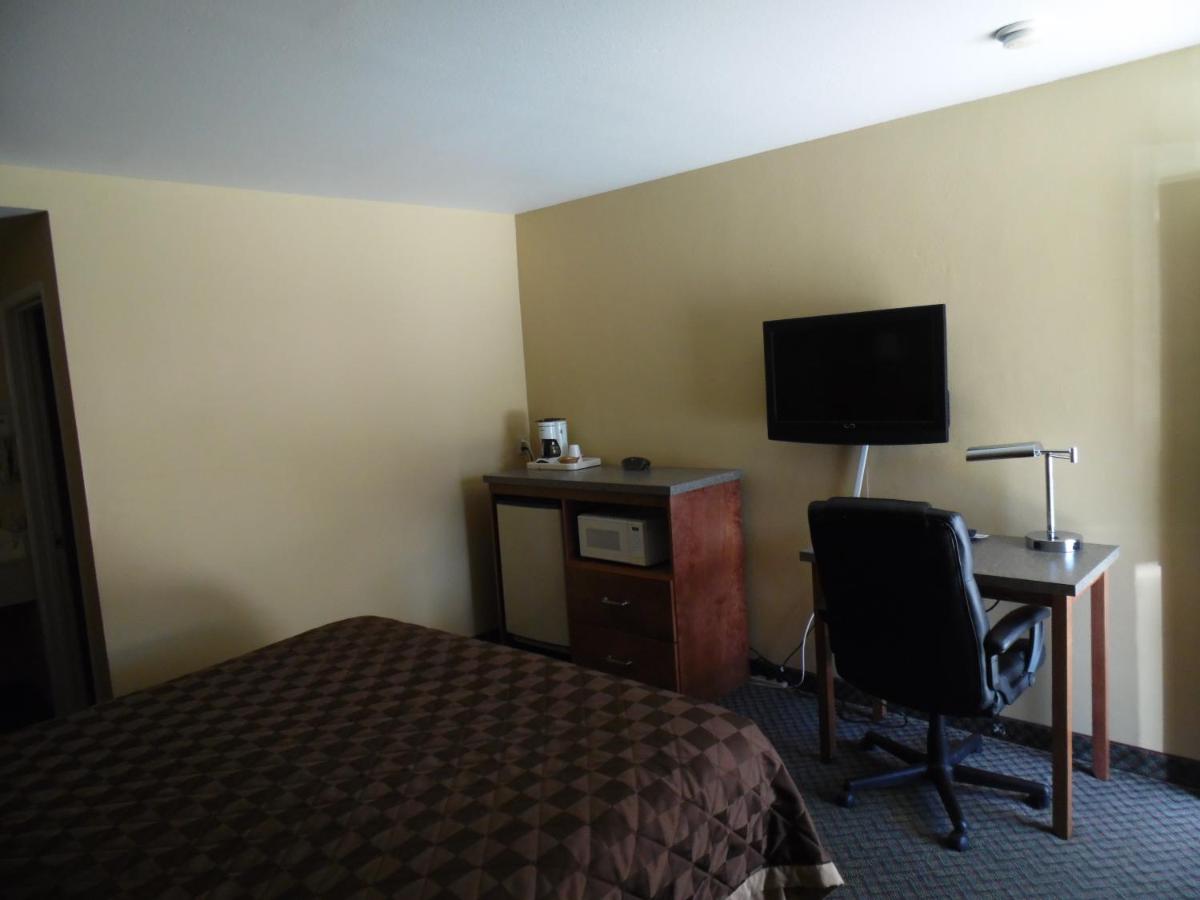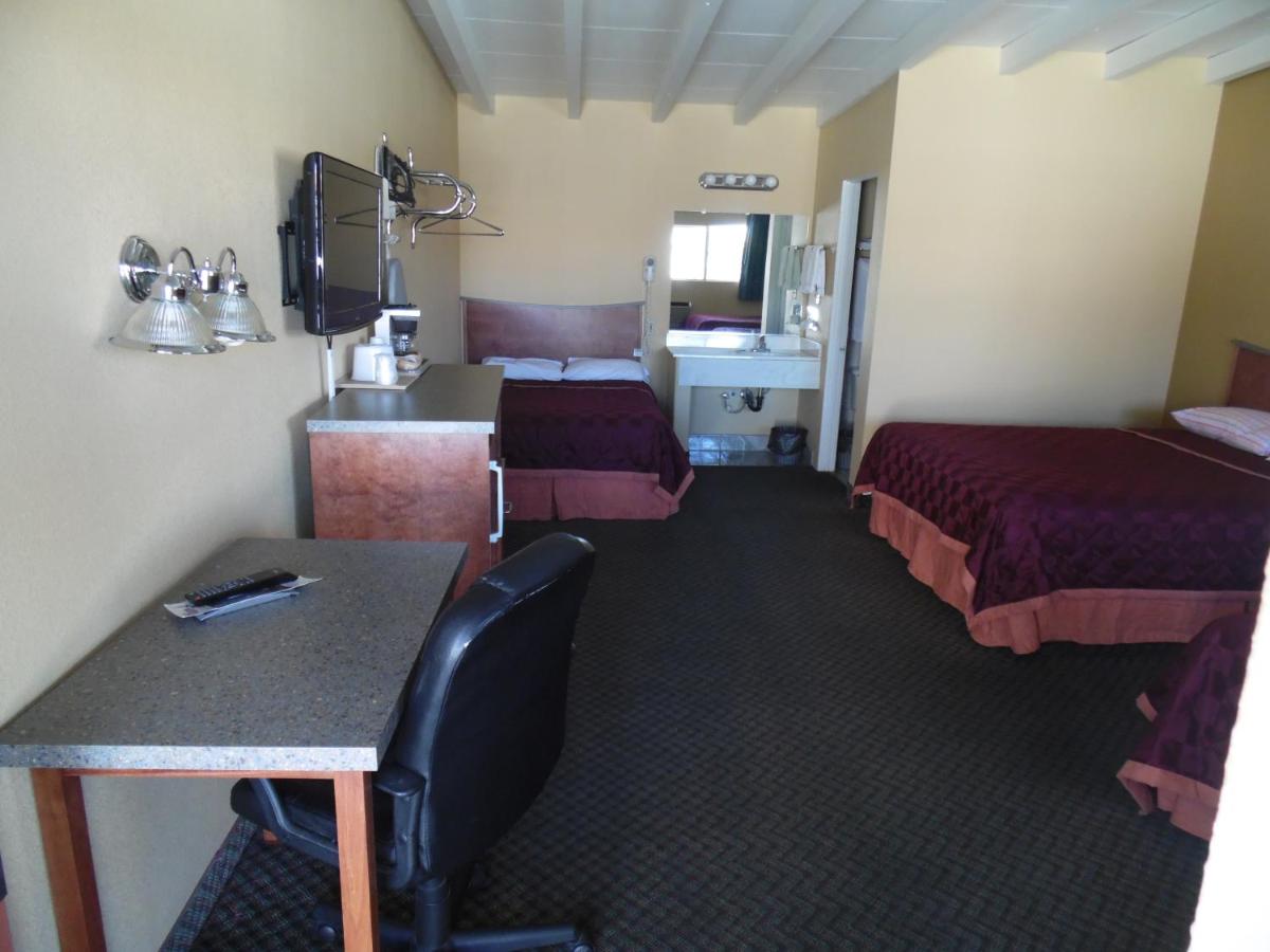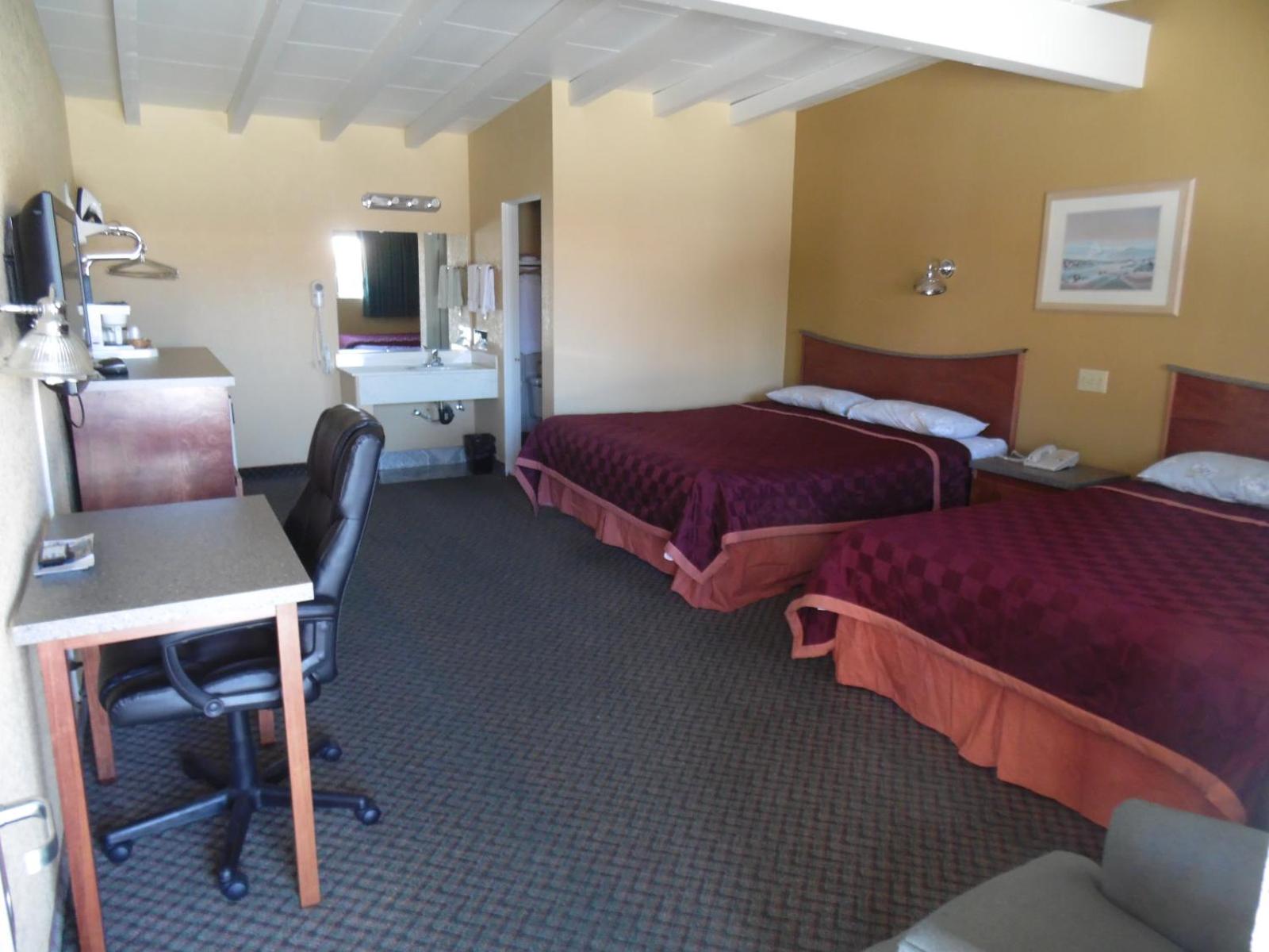 Exterior images show the motel’s classic roadside design and inviting outdoor pool. Interior shots highlight clean, functional rooms with warm lighting and natural tones.